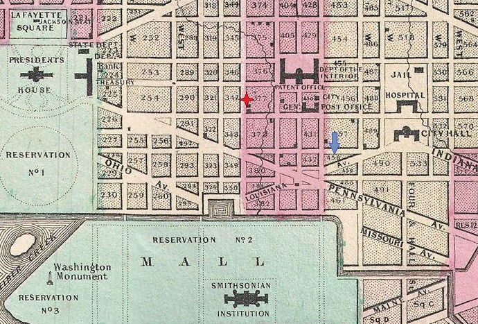 In the above map, the blue arrow points to 634 D Street NW in Washington, D.C., as it was in 1861.  During the Civil War era and for many years after it, this location held the prestigious and profitable printing company of Polkinhorn and Son.  Its founder was Henry Polkinhorn: