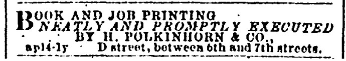 As a young man, Henry Polkinhorn, Jr relocated to D.C. and married Marianne Brown in 1839.  Together Henry and Marianne had six children.  Marianne died in 1857 and Henry married Rachel Ann Barnes less than two years later.    Differing from his father, Henry entered into the trade of a printer to support his growing family.   In his chosen occupation, Henry Polkinhorn was extremely successful.  After a few years of increasing success in his printing trade, Polkinhorn was able to erect his own building at 634 D Street NW between 6th and 7th streets.