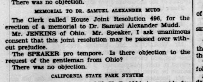 The next year, during the 75th Congress, Representative Randolph of West Virginia was at it again. He introduced H. J. Res. 87 again calling for the “erection of a memorial to Dr. Samuel Alexander Mudd”. The bill was, once again, sent to the Committee on Public Lands. As before, The Society for Correct Civil War Information was on the offensive over this measure: