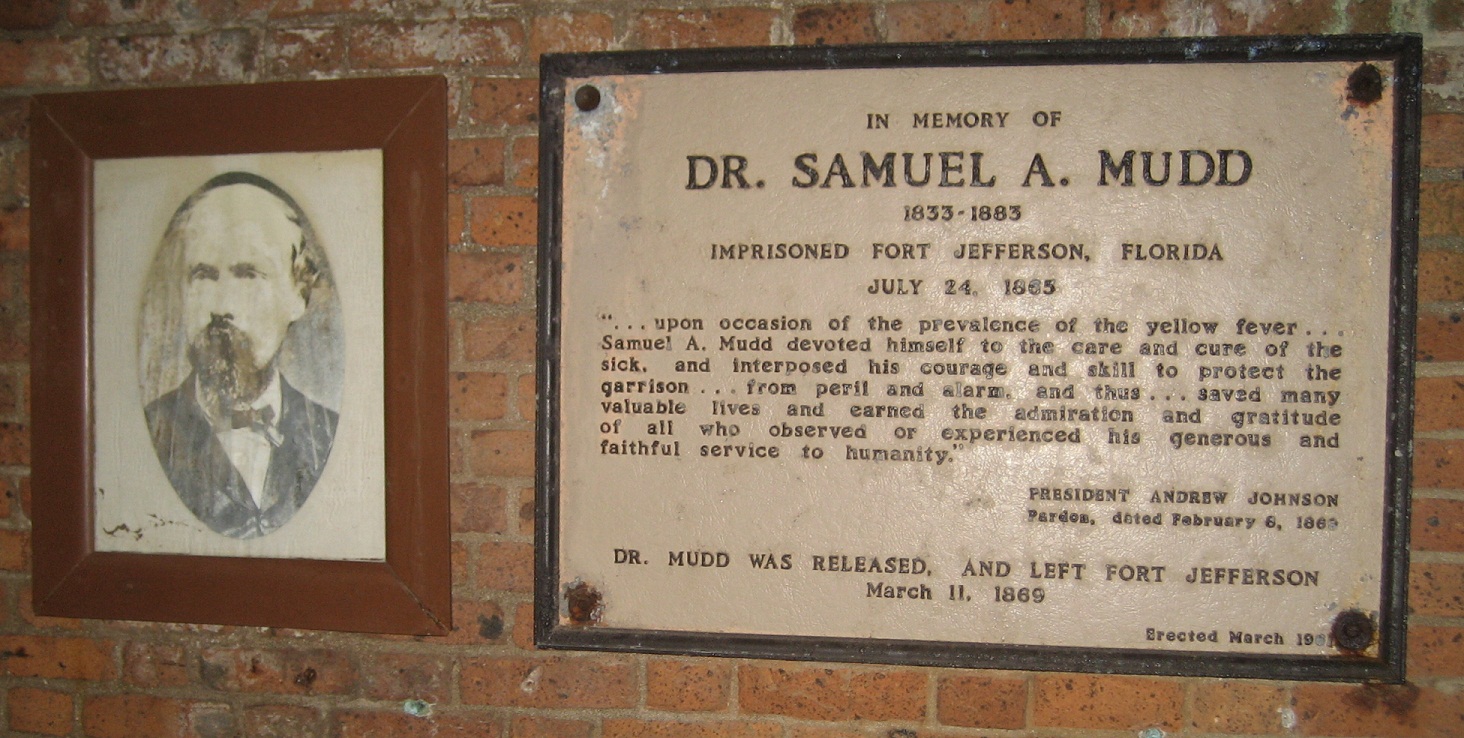 In the former cell of Dr. Samuel A. Mudd and the other Lincoln assassination conspirators in Fort Jefferson, there is a memorial plaque in honor of its most famous inmate: