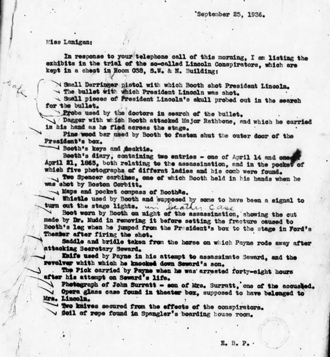 EDIT: Thanks to the wonderful memory of researcher Wesley Harris, an expert on the weapons used by the conspirators, here is another piece of evidence of Mr. Pitts’ employment at the War Department. The following letter is to a Miss. Lenigan who apparently asked what items were in the possession of the War Department in 1936. This list was sent to her by E. B. P. or Edwin B. Pitts: