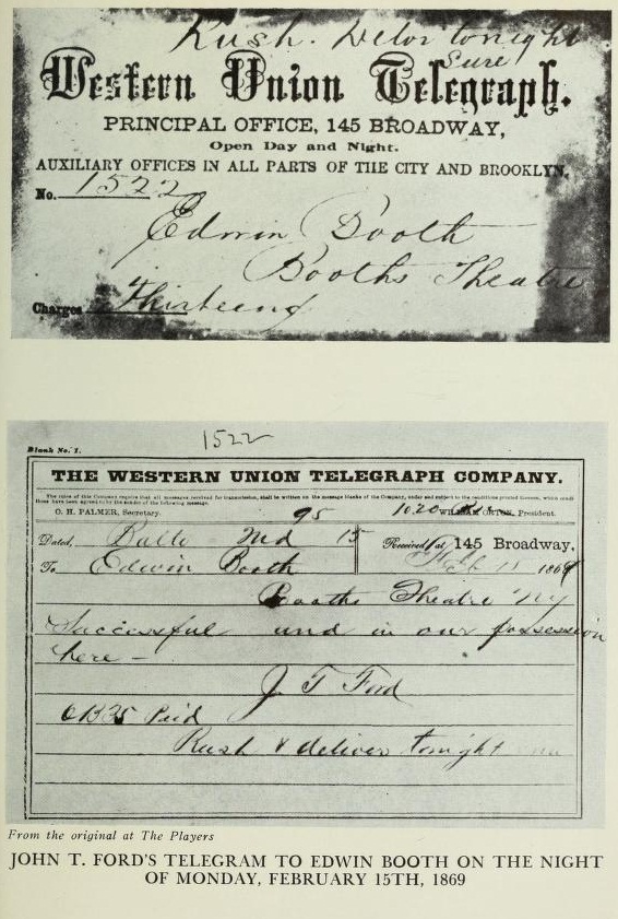 Shifted to a plain deal coffin, the body was conveyed to the train leaving Washington at seven-thirty and reaching Baltimore at nine. From the train it was removed to Weaver’s on Fayette Street, and that night John T. Ford, who had been keeping general oversight of the matter, sent a telegram marked ‘Deliver tonight sure.’ It read (as delivered):