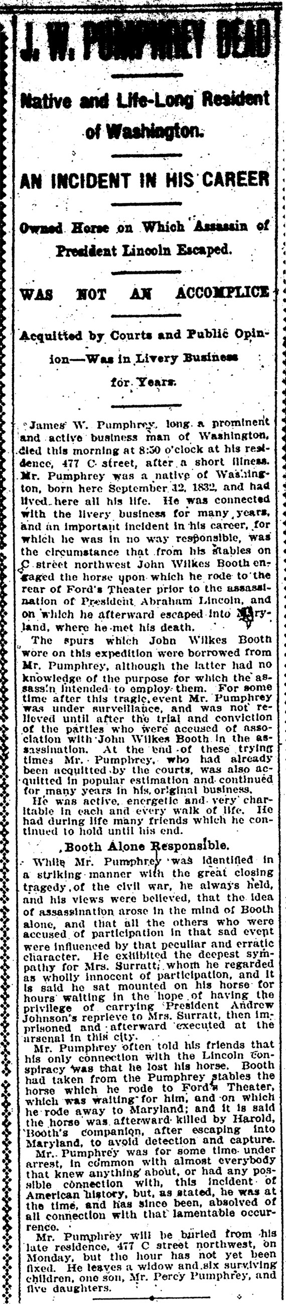 “James W. Pumphrey owned a livery stable on C Street in Washington, D.C., just behind the National Hotel where Booth stayed when he was in town. Booth became a patron of Pumphrey’s, renting horses from him on several occasions, including the night of the assassination. Booth stopped by Pumphrey’s stable shortly after noon on April 14th, asking to reserve a particularly horse, and to have it ready at 4 o’clock that afternoon. When Booth stopped by the livery the horse had already been rented to somone else and Booth had to settle for a bay mare.” – Steers, Assassination Encylopedia