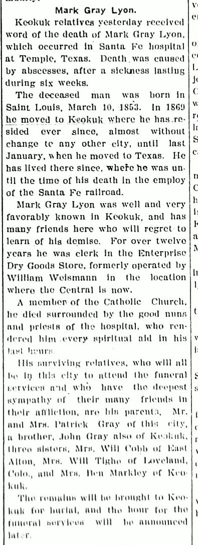 Unsurprisingly a bachelor his whole life, Mark Gray was buried with his sister and her husband in the Catholic section of Keokuk’s Oakland Cemetery.