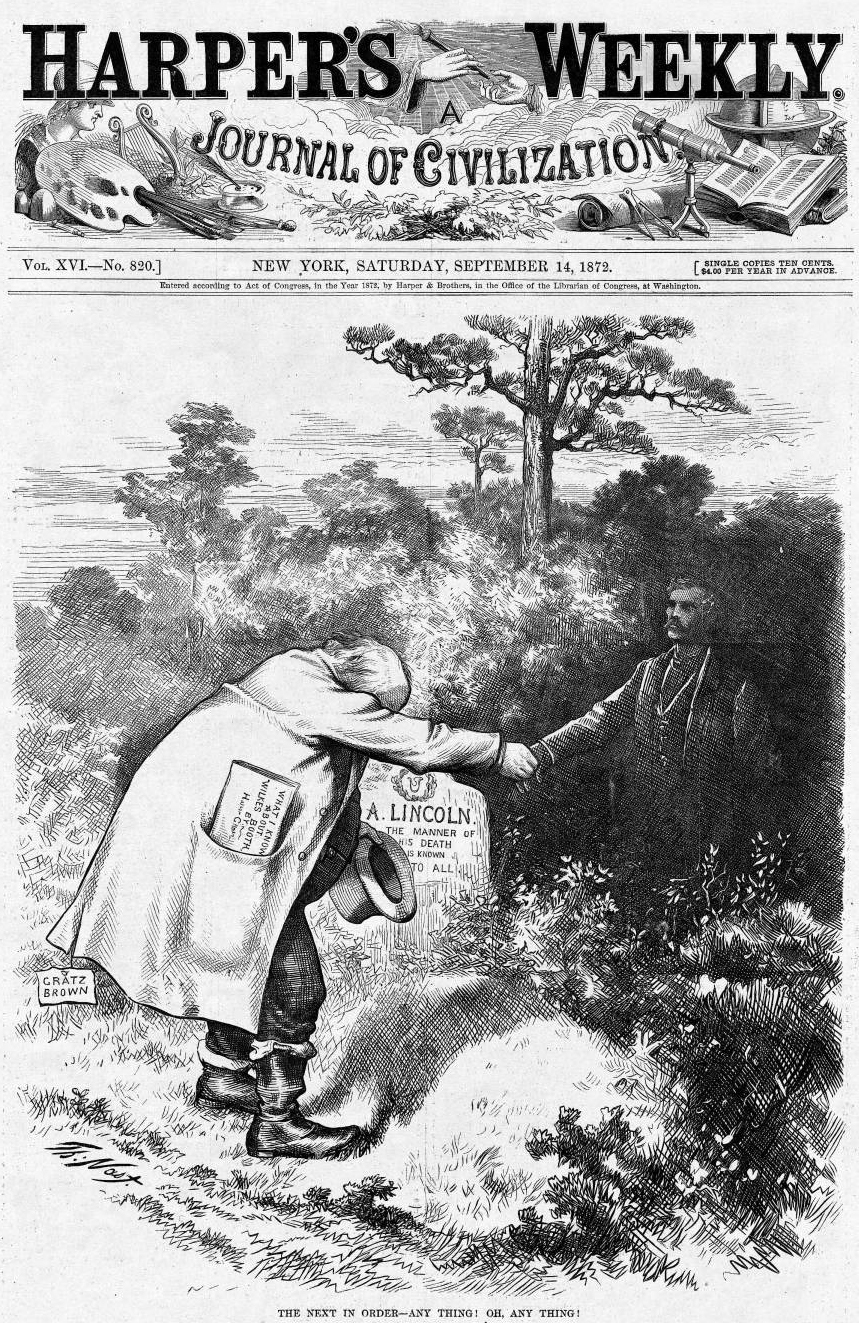 1872 Harper’s Weekly political cartoon by Thomas Nast showing Presidential candidate Horace Greeley shaking hands with John Wilkes Booth’s spirit over Abraham Lincoln’s grave. Due, in part, to Nast’s severe character assassination of Greeley through his cartoons, Greeley lost the election to U.S. Grant.