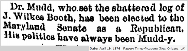 In April of 1876, newspapers across the country ran small snippets declaring the recent election of Dr. Mudd to the Maryland State Senate: