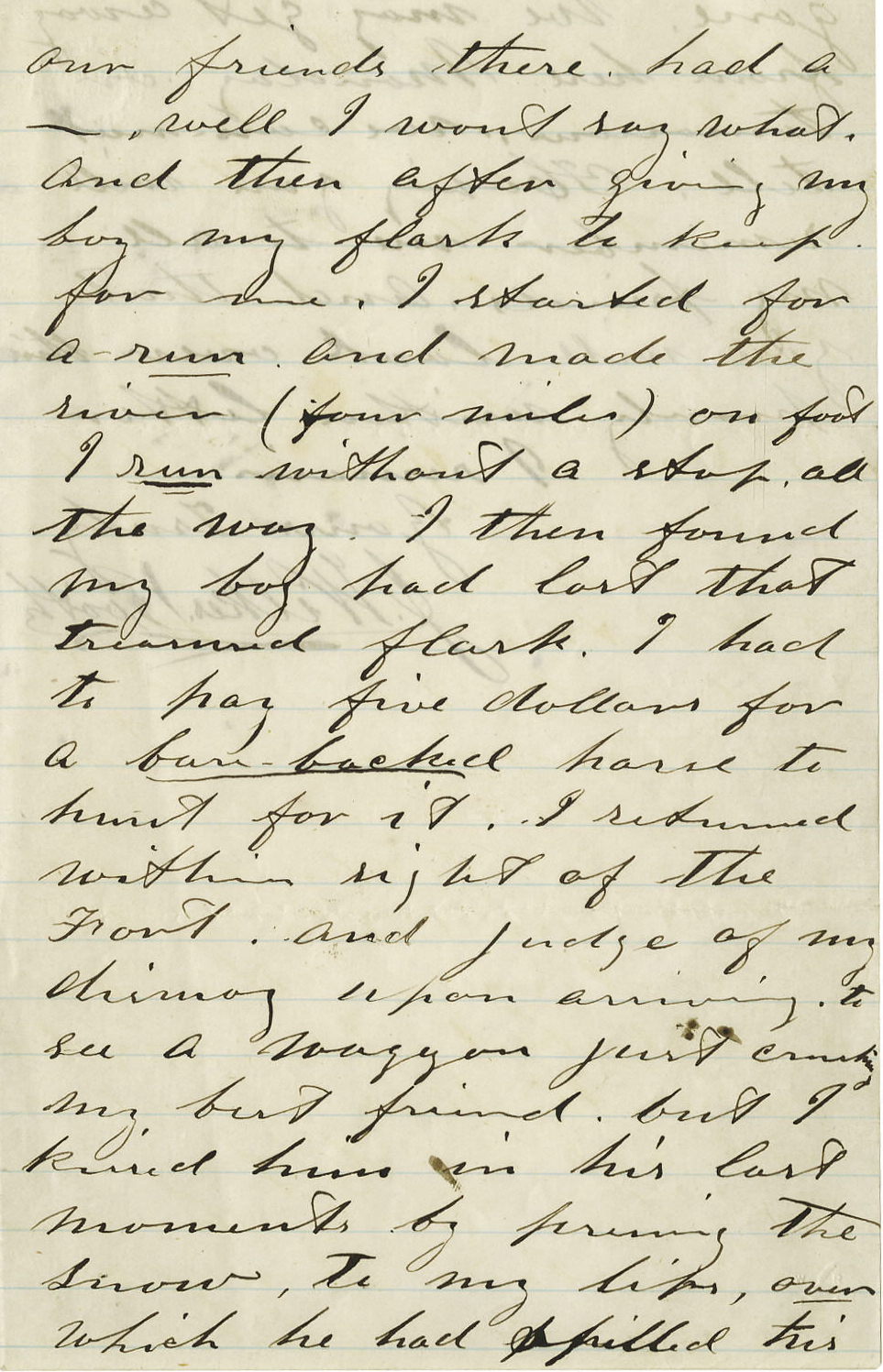Portion of a John Wilkes Booth letter in which he recounts the loss of his flask in the snow.