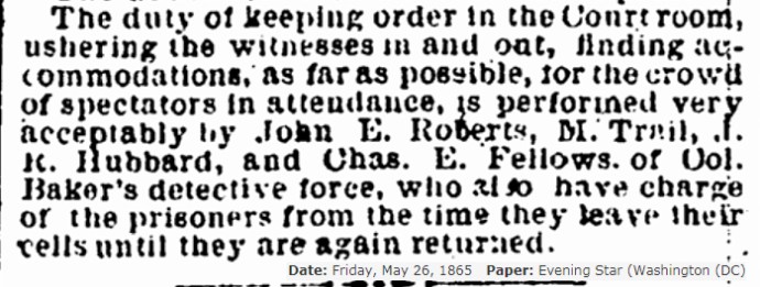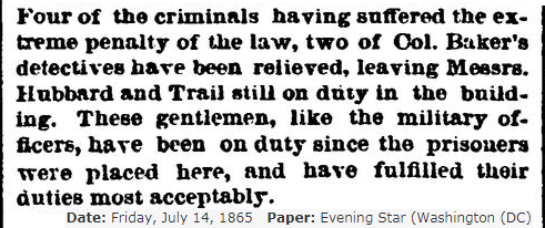 Hubbard served as Baker’s spy at the Old Arsenal Penitentiary starting on April 29th. Once the trial of the conspirators started, Hubbard and the other detectives were tasked with further duties:
