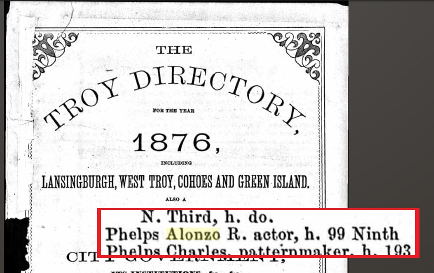 Near the end of Joseph Mayhew’s affidavit he mentions that when his father finally presented the cane to him, it was also accompanied by, “a copy of ‘The Trojan Observer,’ a newspaper dated Monday, January 26, 1880, and published at Troy, N.Y. This newspaper contains an account with reference to the Lincoln cane.” It turns out that the seizure and legal battle concerning the cane was a newsworthy event. The local Troy papers talked about the recovery of the cane and how it would, undoubtedly, be returned to Robert Todd Lincoln. The story of Lincoln’s cane was reprinted across the country. The newspapers, likely getting their information from Stephen Mayhew, reported that the man who recovered the cane was named A. R. Phelps, the stage name of actor Alonzo Raymond Phelps. This name concurs with the Mayhew children’s statements years later. Also helpful to the Mayhews’ statements is the fact that Alonzo Phelps, for a brief period of time in the mid 1870s, did reside in Troy, NY as evidenced by his inclusion in a Troy city directory.