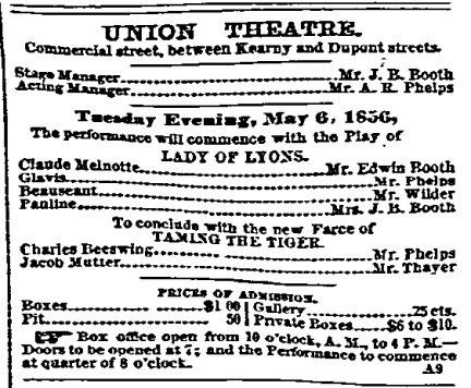 The entry for A. R. Phelps in the 1870 edition of Brown’s History of the American Stage states that, “in 1854 [Phelps] sailed for California, in company with the Denin Sisters, where he opened in ‘Love’s Sacrifice,’ on April 10 of that year. He remained on that coast, playing through California, Oregon, Nevada, etc., until 1866, when he took the overland trip to New York.” Further research demonstrates Phelps’ long residence in California where he worked as both an actor and a theater manager. In 1856, for example, A. R. Phelps and fellow actor Junius Brutus Booth, Jr. leased the Union Theatre in San Francisco. Among the actors the business partners brought in that season was June’s younger brother, Edwin Booth, who was just beginning his starring theatrical career.