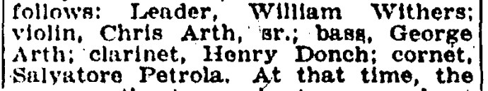 “To date the partial roster, which I have is as follows: Leader, William Withers; violin, Chris Arth, sr.; bass, George Arth; clarinet, Henry Donch; cornet, Salvatore Petrola.”