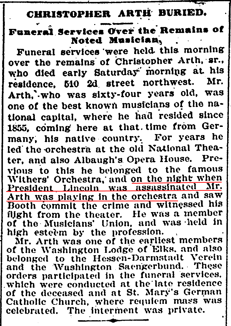Chris Arth was the cousin of George M. Arth, the would-be soloist for “Honor to Our Soldiers”. His 1901 obituary, which is also one of the pieces of evidence for his presence at Ford’s Theatre, gives a good description of his life.
