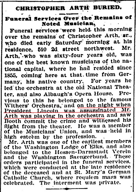 If we trust his obituary and Birdsell’s list, then Chris Arth, cousin of George Arth, was in the orchestra at Lincoln’s assassination.