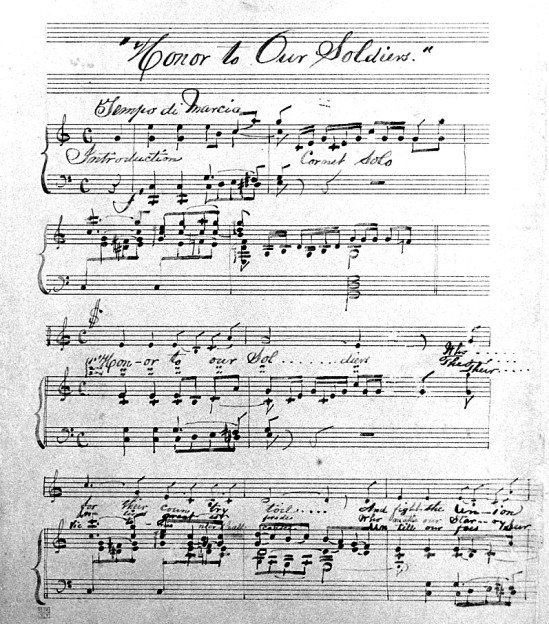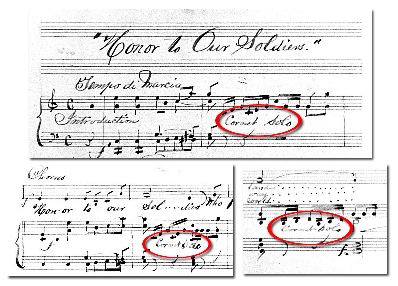 One additional fact could be taken as, perhaps, circumstantial evidence in favor of Petrola’s presence, however. The only instrumental solos contained on William Withers’ handwritten copy of his song, “Honor to Our Soldiers”, is for a cornet. In fact, the cornet gets three solos over the course of the song.