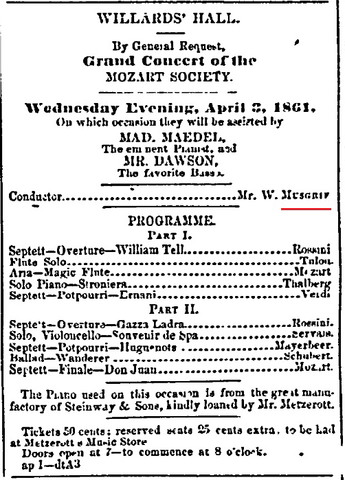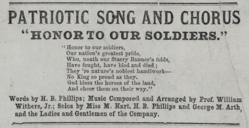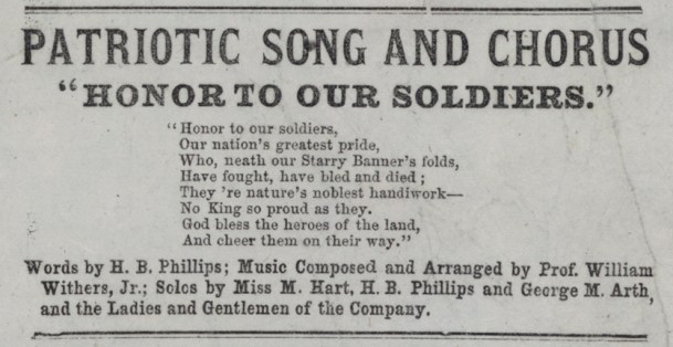 “The music under the leadership of Prof. Wm. Withers was highly pleasing, and the execution of the national airs gave a spice to the entertainment, which was fully appreciated.”