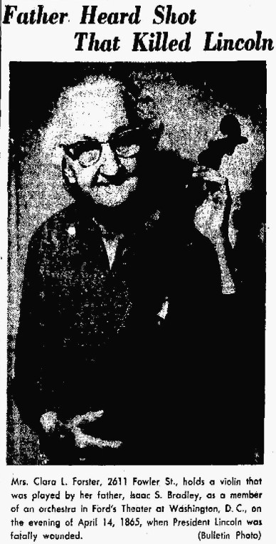 While I have yet to find any period documentation of Bradley’s presence at Ford’s Theatre during his lifetime, in 1960, his elderly daughter Clara Forster was interviewed by a newspaper in her home of Anderson, Indiana. She stated that during her father’s military service, he “fell victim to a rheumatic ailment that hospitalized him for some time in Washington,” and that he, “was ready to accept the offer to play in the orchestra at Ford’s Theater in Washington because he had with him his own Amati violin…”