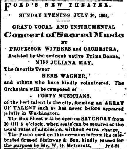 Theatrical seasons ended during the hot months, which left many musicians without jobs during the summer. Without the steady (albeit small) income from the theaters, musicians had to make their own arrangements. During this time, many teamed up with other musicians to play small concerts in music halls. With his connections, Withers was able to rent out bigger venues. During the summer of 1864, Withers and his orchestra played concerts at both Grover’s and Ford’s theaters. On July 10, 1864, Withers presented a “Concert of Sacred Music” at Ford’s, for which he brought in two vocalists and “forty musicians of the best talent in the city, forming an array of talent such as has never before appeared jointly in Washington.” The concert was well received, and the proceeds helped the D.C. music scene make it through the lean summer.