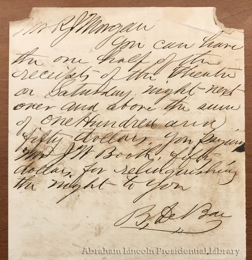 With Booth’s note in hand, Morgan approached Ben DeBar seeking permission to perform at his theater. Since Booth had given his blessing, DeBar consented. Morgan wanted his debut to be a benefit performance for himself, where he would be entitled to a share of the box office. On the back of the same note Booth had written, DeBar gave his terms.