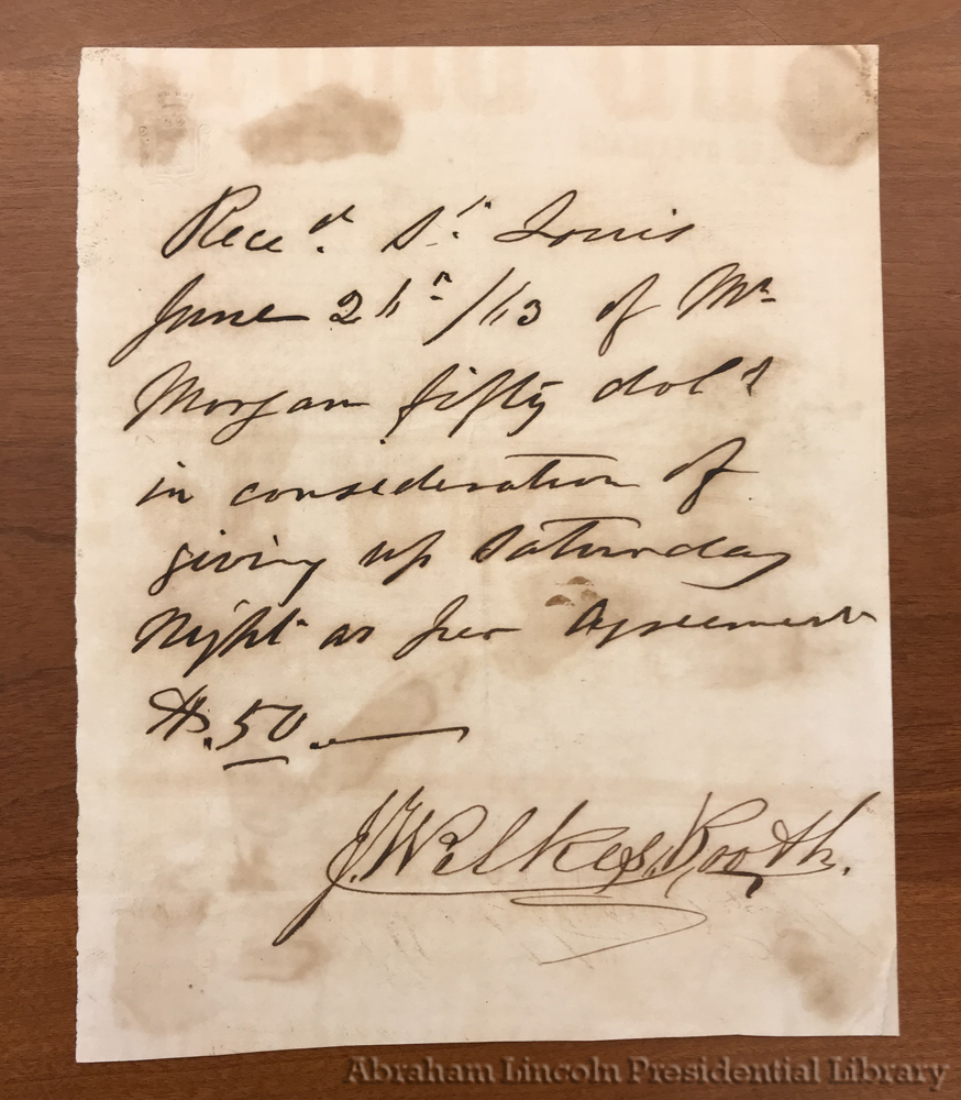 On Friday, June 26th, Morgan paid John Wilkes Booth the $50 he was owed. Booth then jotted down a note for Morgan, which acted as a receipt.