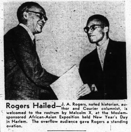 In many ways, Joel Rogers was a kindred spirit to Malcolm X. When asked about his writing on the topic of Black history, Rogers stated that his motivation stemmed from his, “early childhood when it was firmly impressed on me by the ruling class that black people were inherently inferior and that their sole purpose for being was to be servants to white people and the lighter-colored mulattoes.”[9] Rogers rejected the white supremacist doctrine of his youth that Blacks were inherently inferior to whites. Similarly, Malcolm X vividly recalled his own childhood memories of being called by racial epithets and being treated poorly by whites of all classes. Yet, like Rogers, Malcolm witnessed the inherent strength and promise of the Black race, even while a white supremacist society tried to keep him down. Malcolm had the benefit of having been born to activist parents and in his autobiography, Malcolm recalled being transfixed by meetings his father organized: “I remember how the meetings always closed with my father saying, several times, and the people chanting after him, ‘Up, you mighty race, you can accomplish what you will!”[10] It is no surprise then that Malcolm X was a firm proponent of Joel Rogers’ work. Rogers helped to provide Malcolm with a historical basis for the strength and self-dignity that Malcolm X knew Black people possessed, despite the attempts of white supremacy to deny them this heritage.