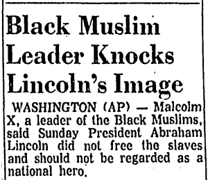 In an Associated Press article that was published in newspapers around the country just two days before the March on Washington, X repeated his message charging that King was allowing the government to co-opt what should otherwise be a revolutionary act. He lamented that the march was now being, “controlled by the government and is being used for political expediency.”[21] However, this larger message was overshadowed in the press due to X’s decision to make mention of Abraham Lincoln and the fact that the march was to end at the Lincoln Memorial. Instead of headlines for the article highlighting the Civil Rights leader’s critique of outside influence on the march, many of the nation’s leading newspapers carried the article under headlines like, “Black Muslim Leader Knocks Lincoln’s Image”, “Lincoln No Hero, Malcolm X Insists”, and “Lincoln Didn’t Free Slaves – Malcolm X”. In Abraham Lincoln’s former hometown of Springfield, Illinois, the Illinois State Journal titled the story with “Abe Failed Negroes: Malcolm X”. The change of focus away from the march and onto Abraham Lincoln was due to X, once again, engaging in a form of historical analysis on Lincoln’s legacy. In the article Malcolm X stated: