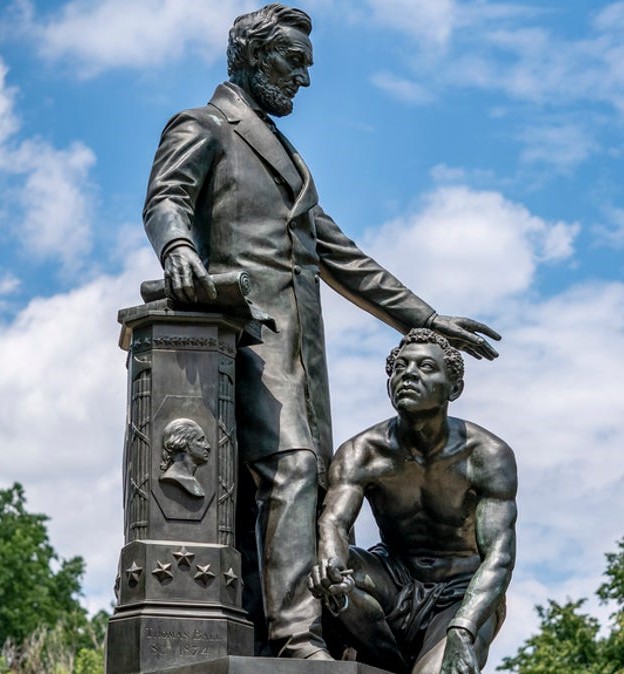 Yet, even as Joel Rogers uses Lincoln’s own words to criticize the 16th President, the historian is not unfeeling or ignorant of the circumstances Lincoln found himself in. Rogers writes, “There is much I admire about Lincoln and I sympathize greatly with him for the many trying problems he had to face but in all fairness it must be said that he owed vastly more to the Negro than the Negro to him.”[16] As Rogers posited, it was the Black troops that helped to turn the tide of war in the Union’s favor. The increased manpower brought about by the enlistment of Black soldiers and the devotion with which they fought for the cause of freedom, saved Lincoln from suffering the fate as vanquished Confederate President Jefferson Davis. But, more importantly, Rogers defends his criticisms of Lincoln’s words and personal views even if it seems contrary to the popularly accepted interpretation of the Great Emancipator. Rogers writes, “Lincoln became the bible of the great Negrophobes.”[17] According to Rogers, Black Americans put too much stock in Lincoln the politician who only directly freed a miniscule amount of enslaved people in order to win a war. This mythology caught on so much that the power of Black Civil War soldiers was diminished so as to essentially remove them from the narrative. Black Americans were expected to bow and pay reverence to Lincoln for their freedom rather than acknowledge their own success. Perhaps this idea is personified best by the nature of the statue Frederick Douglass helped to unveil in 1876 which shows a formerly enslaved man kneeling at the feet of Lincoln who is beckoning him to stand up.