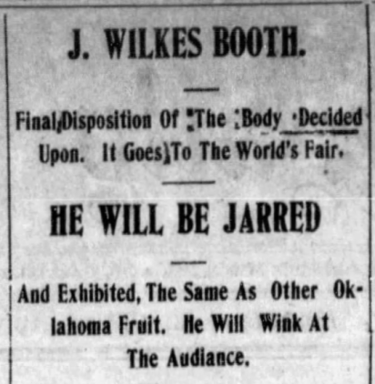 And so it was that on August 17, 1903, The Enid Daily Wave made the bold announcement that a decision had finally been made on what to do with the body of “John Wilkes Booth”. According to the Wave, since the St. Louis World’s Fair (technically known as the Louisiana Purchase Exposition) was planned for the next year, it had been decided to make the body of “John Wilkes Booth” part of the displays in the Oklahoma pavilion at the fair. But how, might you ask would “Booth” be made to transport to the Fair? Well, like any other preserves, “Booth” was to be jarred: