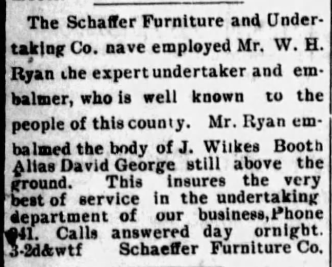 The final disposition of the well preserved remains of J. Wilkes Booth still lying in state, in an Enid morgue has been decided upon. Dr, Eugene Watrous who is one of the designate World’s Fair chemists, has been audthorized to order a preserving jar large enough to hold a man sitting up right. Just as soon as the large clear plate glass jar arrives Booth will be placed in it, in full dress suit, sitting on a chair. The jar will be filled with the same embalming fluid, used in the preservation of fruit, surrounding the body.