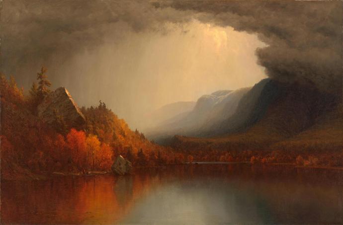 The painting shows a forested lake in the Catskill mountains on an autumn day. A group of Native Americans sit, almost camouflaged, with their teepees near a large rock on one side of the lake. On the other side, a black thunder cloud is breaking over a mountain though it has not yet has not yet blotted out the sun. Melville was not the only one impressed by Gifford’s painting. According to one reporter, “As a landscape there is nothing finer in the exhibition.”