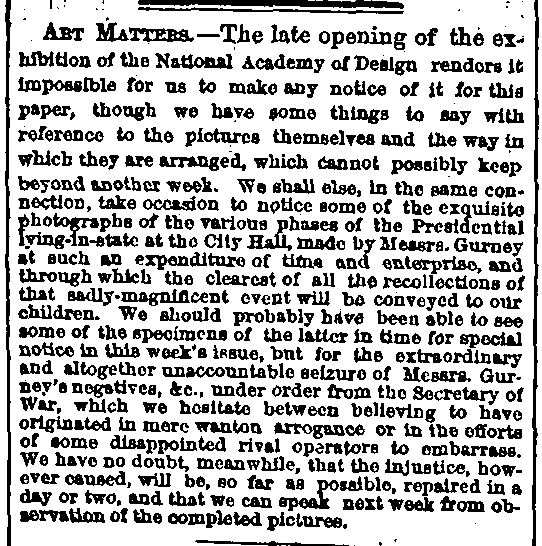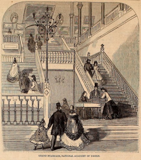 Two days later, on April 27, The National Academy of Design, feeling that it was in bad taste to have a big grand opening celebration, opted instead for a soft launch of sorts. The invited guests for the debut were a large, but select group who became the first to tour the new palace to the arts and enjoy the inaugural exhibition. The opening was done so quickly, and so closely to the President’s funeral in the city, that some members of the press didn’t have time to write up their reviews for lack of space. Interestingly, the weekly New York Atlas newspaper briefly discussed the opening of the National Academy of Design while, in the same story, lamenting the seizure of photographs from the Lincoln funeral by the War Department.