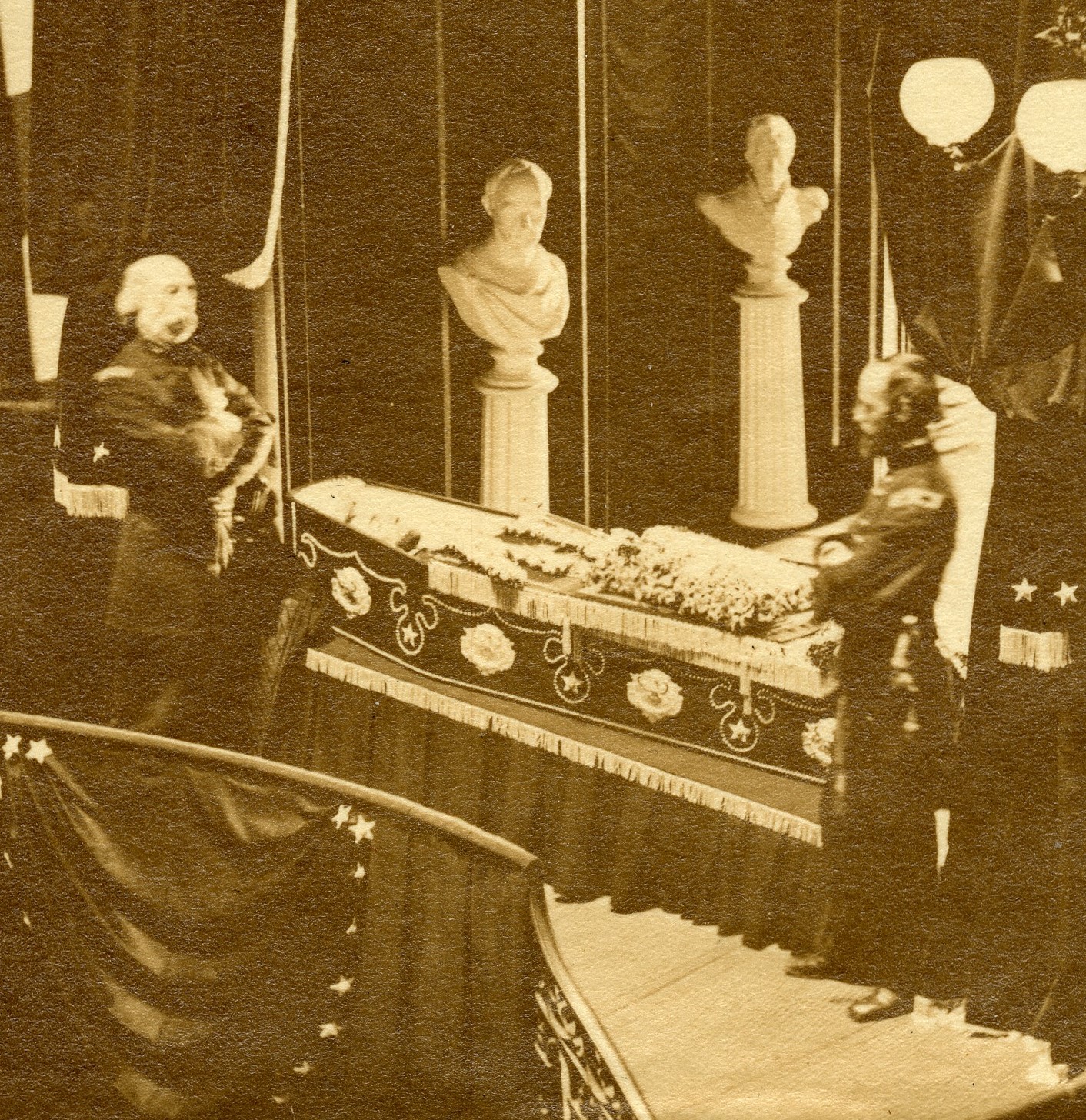 Despite the reporter’s hope to see photographer Gurney’s “completed pictures” of the Lincoln funeral, the one picture of Lincoln lying in state shown above would not be publicly seen until 1952. After hearing that a photograph had been taken of Lincoln’s body, Secretary of War Edwin Stanton order the glass plate negative destroyed. This was done, but not before a single print was made and sent to Stanton. This print was later found after Stanton’s death by his son Lewis. Lewis Stanton sent the print to John Nicolay, one of Lincoln’s personal secretaries who was working on a series of biographies about Lincoln with fellow secretary John Hay. Nicolay and Hay never used the photograph in their books. In 1952, the photograph was rediscovered by 14 year-old Ron Rietveld who was looking through a collection of Nicolay-Hay papers donated to the Illinois State Historical Library. It was quite the discovery.