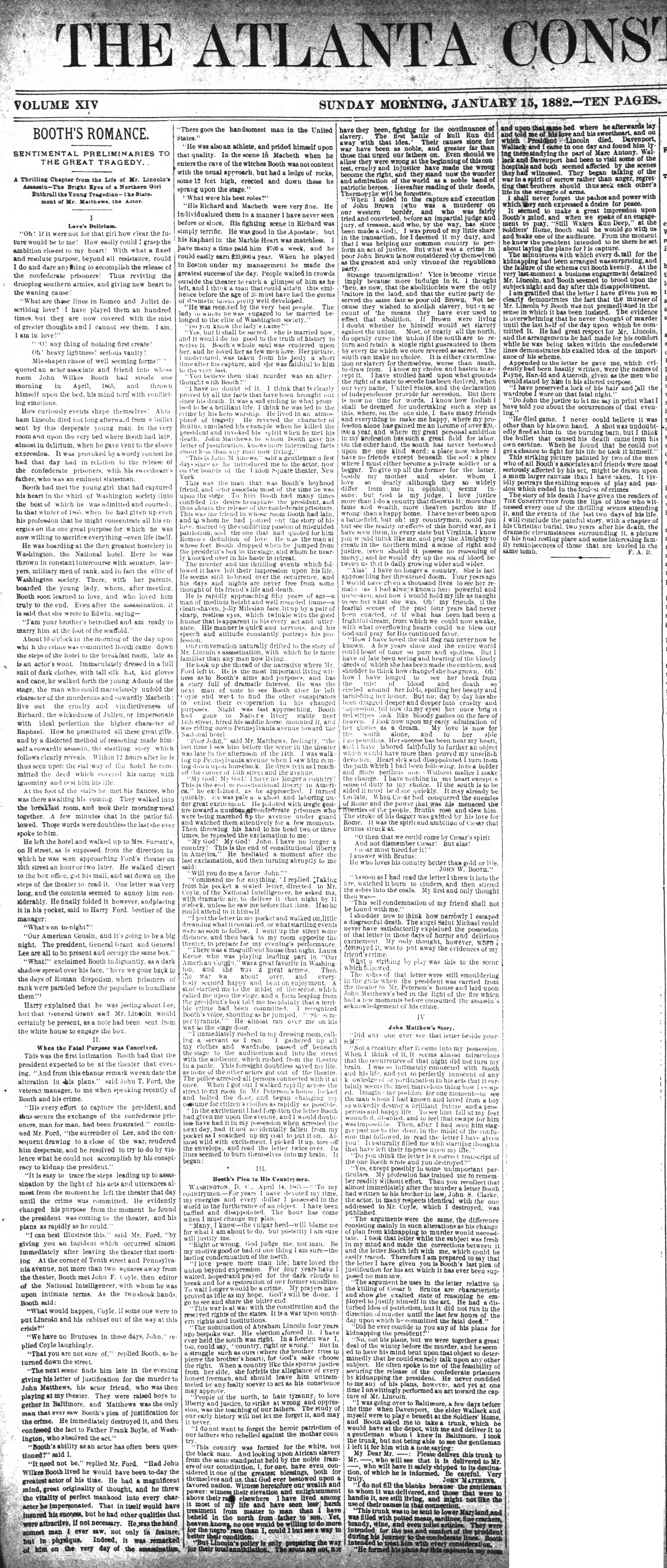 Another paper that reprinted Frank A. Burr’s work was The Atlanta Constitution. They published the story of Burr’s visit to the Garrett farm on Sunday, December 11, 1881. A month later, on Sunday, January 15, 1882, the Constitution published another article attributed to Burr titled “Booth’s Romance”.