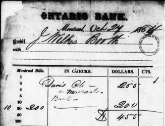 John Wilkes Booth did deposit $455 into a Montreal branch of the Ontario Bank on October 27, 1864. At the same time, he purchased a bill of exchange for a little over 61£. Copies of this bill of exchange were found on Booth’s person upon his death at the Garrett farm. The purpose of the money in Booth’s Canadian bank account is unknown. He never withdrew or used the money. I’m not surprised this series has decided to use this enigmatic deposit to tease possible Confederate involvement. Many authors and researchers have attempted to connect the same dots, though, in my opinion, none have done so convincingly. We’ll have to wait and see how this series presents its case.