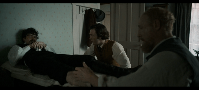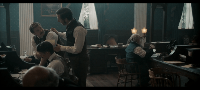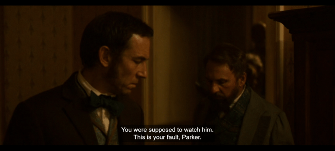 Second, the acting is very good. While I still say that lead Tobias Menzies should have been adorned with Stanton’s signature skunk beard, by the end of the episode, his charisma in the role caused me to forget about it. Menzies plays Stanton in a very sympathetic way in this episode. He’s quite different than practically all other portrayals of the gruff Mars, Lincoln’s own “God of War.” There is logic to this, for while a more cantankerous Stanton might be more accurate, it’s hard to believe an audience would support such a portrayal as their leading man. Over the course of seven hour-long episodes, I’ll take a softer, beardless Stanton that’s easier to empathize with. Anthony Boyle still looks great as Booth and plays the role well. At the moment my only criticism of Booth is more with the writing than the performance. The writing isn’t bad, but it punches down a bit at Booth, removing some of the complexity of his character. He’s referred to as an actor who plays “supporting roles” and one who is “smaller in person.” So far, the only motivation given for Booth’s actions seems to be a professional and personal rivalry between himself and his father/brother. He’s portrayed as a racist, as he should be, but in this first installment, we don’t get a good grasp of why he decided to kill Lincoln. Given the series’ love of flashbacks, I’m hopeful we’ll learn more about Booth’s background in future episodes. My favorite acting performance so far is that of Damian O’Hare in the role of Thomas Eckert. The man looks a lot like Eckert to begin with and, as a sidekick of sorts, he has a lot of great interactions with Menzies’ Stanton. I’m looking forward to seeing more of Eckert going forward.