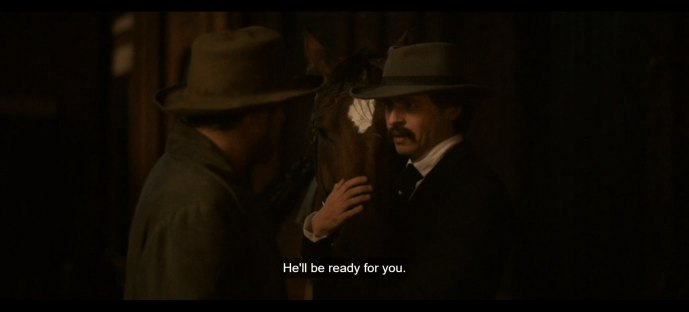 In my opinion, this was an incredible way to introduce the audience to the villain of this drama. For the next minute, we follow the assassin’s hands as he readies himself for the events to come. He gathers his weapons and supplies before heading out. He meets up with his fellow conspirator, David Herold, and pays for their rental of two horses. It is then that the first real lines of the show are uttered. Booth tells Davy to, “Round up everybody. It’s a go!”