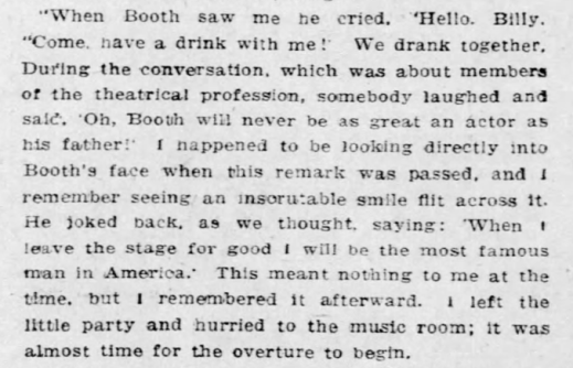 The source for this story is not John Parker, but William Withers, the Ford’s Theatre orchestra leader who got slashed by Booth’s knife as the assassin was rushing backstage after committing the deed. While Withers was an eyewitness to the assassination, his stories regarding the event evolved considerably with each retelling over the years. The way in which Booth slashed at him increased in ferocity, and the wounds that he received grew in size and severity as each decade passed. And it wasn’t until forty years after the assassination that he even mentioned having shared a drink with Booth on that fateful night. The first time this detail appeared was in an interview Withers did in 1905 when he was about 70 years old. The orchestra leader recalled to a newspaper reporter that he shared a drink with Booth just before the overture of the show. However, he made no mention of Booth’s ominous remark about “leaving the stage.” He merely noted that Booth was even more “fidgety and excitable” than usual. By 1911, Withers had altered his story and stated that during their drink at the Star Saloon, someone else at the bar stated that Booth would never be as great an actor as his father. It is in this telling that the “famous” quote appears in print for the first time.