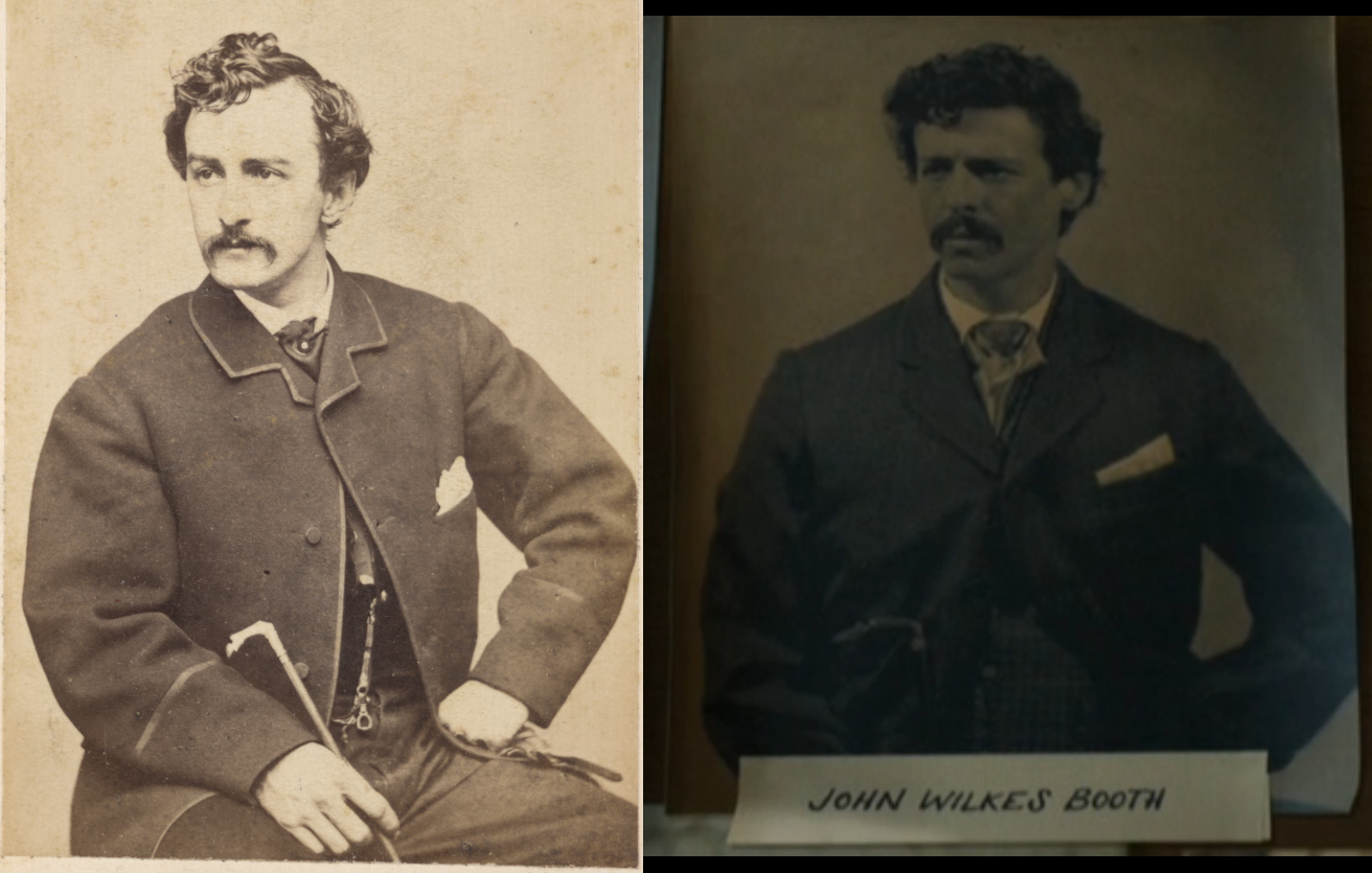While these images are decent recreations of the originals, where the series has done a better job has been replicating the images of David Herold and Booth that were subsequently used on the wanted posters. Boyle’s Booth is holding a cane just like the real image, and the photo of a young David Herold has been very closely matched.