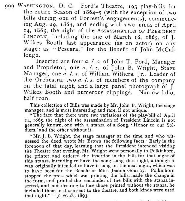 “999 Washington, D. C. Ford’s Theatre, 193 play-bills for the entire Season of 1864-5 (with the exception of two bills during one of Forrest’s engagements), commencing Aug. 29, 1864, and ending with TWO BILLS of April 14, 1865, the night of the ASSASSINATION OF PRESIDENT LINCOLN, including the one of March 18, 1865, of J. Wilkes Booth last appearance (as an actor) on any stage: as ‘Pescara,’ for the Benefit of John McCullough. Inserted are four a.l.s. of John T Ford, Manager and Proprietor, one a.l.s. of John B. Wright, Stage Manager, one a.l.s. of William Withers, Jr., Leader of the Orchestra, two a.l.s. of members of the company on the fatal night, and a large panel photograph of J. Wilkes Booth and numerous clippings. Narrow folio, half roan. This collection of Bills was made by Mr. John B. Wright, the stage manager, and is most interesting and rare, if not unique. ‘The fact that there were two variations of the play-bill of April 14, 1865, the night of the assassination of President Lincoln is not generally known, one with a stanza of a Song, ‘Honor to our Soldiers,’ and the other without it. ‘Mr. J. B. Wright, the stage manager at the time, and who witnessed the deed, wrote Mr. Brown the following facts: Early in the forenoon of that day, learning that the President intended visiting the Theatre that evening, Mr. Wright went personally to Polkinhorn, the printer, and ordered the insertion in the bills for that night of this stanza, intending to have the song sung that night, although it was originally intended to have it sung on the next night, which was to have been the Benefit of Miss Jennie Gourlay. Polkinhorn stopped the press which was printing bills, made the change in the form, and printed the remainder of the bills with the stanza inserted, and not desiring to lose those printed without the stanza, he included them in those he sent to the theatre, and both kinds were used that night.’ – J.H.B., 1893.”