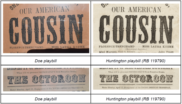 For each point of comparison, I found that the Doe playbill matched the details of the Huntington playbill. Everything was compositionally correct and in the right place to match a genuine first-issue bill.