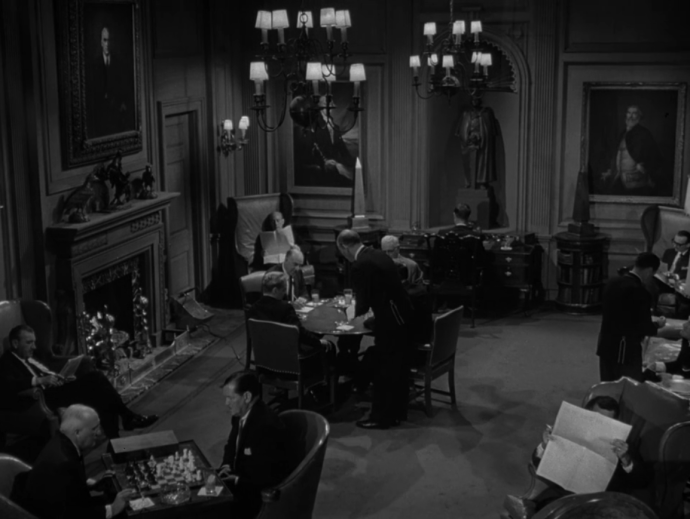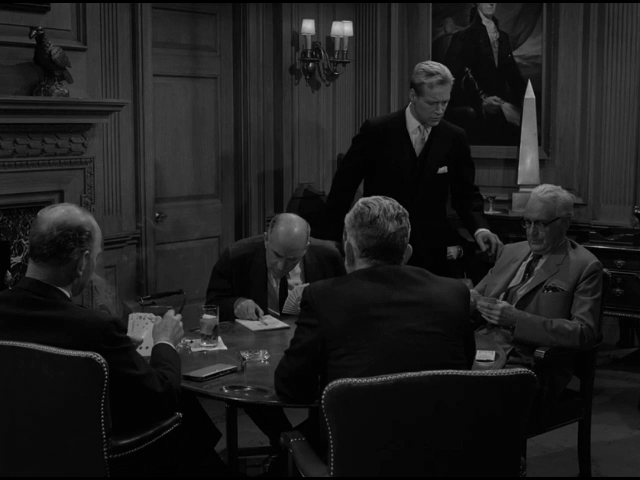 The episode opens with an establishing shot of a building bearing the sign “The Potomac Club. Established 1858.” We fade to the interior of the club and find it to be a traditional gentlemen’s club in the year 1961. The decor is ornate, with various sculptures and paintings throughout the room. There are several seated men around the periphery of the room reading newspapers and playing chess. The club attendants dutifully move around the room, serving drinks to the members. Near the center of the drawing room is a round table with four men seated around it playing cards.