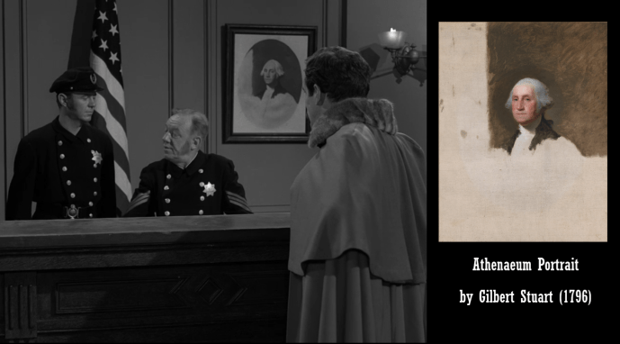 • Behind the police sergeant at the front of the room, there is an American flag on a staff and two portraits. While the flag is not completely unfurled, the visible star pattern looks like it might have been the correct 35-star flag that existed between July 1863 and July 1865. You have to respect the prop department for going out of their way to find a period flag, even though very little of it is seen.