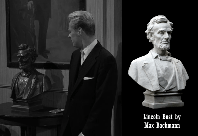 This episode features a custom musical score that was written and conducted by noted composer Jerry Goldsmith. The different tracks of this episode bear titles such as “The Club,” “Return to the Past,” “Ford’s Theatre,” “Mr. Wellington,” “The Wine,” “The Assassination,” and “Old William,” to name a few. As budgetary and time constraints prevented each episode of The Twilight Zone from having its own custom score, the tracks from “Back There” became part of the studio’s stock music collection and were often reused. In all, music from “Back There” can be heard in ten other episodes of the show*. Most notably, “Return to the Past” is heard when the Kanamits make their first appearance to the U.N. in the classic episode “To Serve Man,” and “Ford’s Theatre” is played at the climatic moment of “Nightmare at 20,000 Feet” when William Shatner’s character opens the door of the plane to shot at the gremlin. I’ve created a short video highlighting these examples: