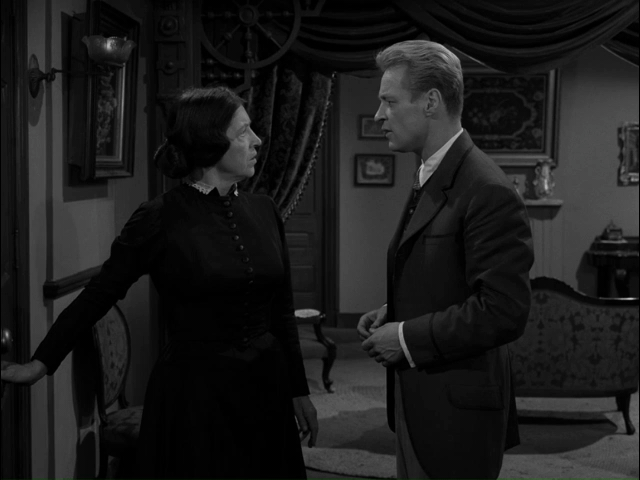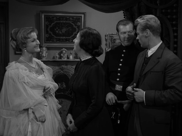 Looking at the period decor in the building that was once his home, Corrigan starts to realize that something is greatly amiss. He asks Mrs. Landers if she has a room in which he can stay. She replies that she does, but only for acceptable boarders. She proceeds to ask Corrigan a series of questions, including inquiring if he is an army veteran. This comes as a bit of a non-sequitur to Corrigan, but he still replies in the affirmative. When he tells Mrs. Landers that he is an engineer, her demeanor completely changes at the thought of a “professional man” lodging in her home. She begins to offer Corrigan a room upstairs when they are interrupted by a couple coming down who greet Mrs. Landers. The elegantly dressed woman confirms that she and her husband, a soldier in a Union officer’s uniform, are having dinner at Willard’s and are then “off to the play.”