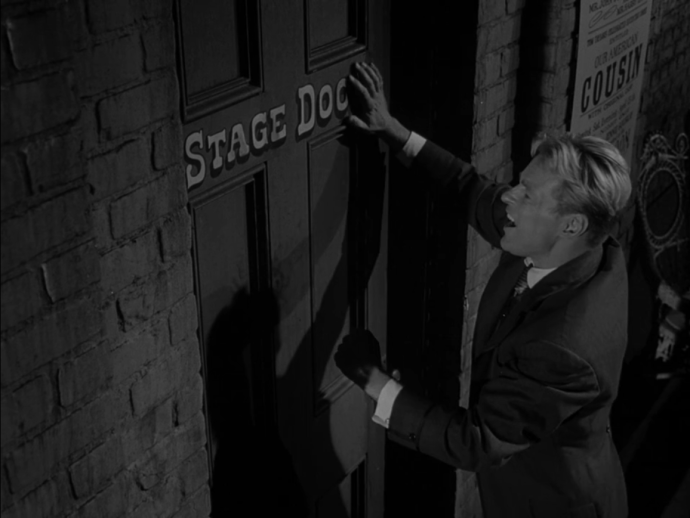 As the dramatic music swells, we cut to Baptist Alley behind Ford’s Theatre. Corrigan rushes past posted theater broadsides and makes his way to the nicely labeled “Stage Door.” Finding the door locked, he proceeds to bang on the door. He yells repeatedly to be let in and says, “The President is going to be shot tonight!”