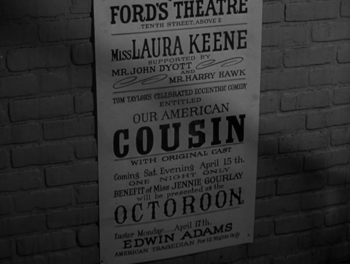 • In the scene where Corrigan is shown running up Baptist Alley and pounding on the stage door of Ford’s Theatre, two large broadsides are shown. One of them is a mock-up of a broadside announcing that night’s performance of Our American Cousin. It is similar in style to a modified Ford’s Theatre playbill and, as far as props go, is well done. The other broadside, only seen as Corrigan runs up, is not a duplicate of the Our American Cousin poster but an advertisement for the next night’s show of The Octoroon. After the assassination of Lincoln, this performance did not go on, but the Ford brothers had commissioned the making of a broadside announcing the performance. In a picture taken of Ford’s Theatre draped in mourning shortly after the assassination, the broadside for The Octoroon can be seen posted on the side of the street near the theater.