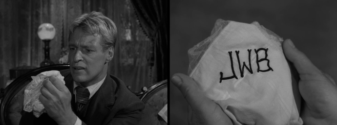 The patrolman helps Corrigan back to the sofa, and Corrigan recalls how Lincoln was shot from behind and the assassin jumped from the box to the stage and out into the wings. The patrolman says, “You’re telling me this as though it’s already happened.” Corrigan, desperate to stop the tragedy and no longer worried if this man will think him crazy, replies, “It has happened. It happened a hundred years ago, and I’m here to see that it doesn’t happen.” Corrigan then asks the chambermaid where Wellington is. The chambermaid replies that there is no one here by that name. Corrigan dismisses this remark and insists on the location of Wellington, the man who brought him there and lives in this room. The chambermaid replies again that no one named Wellington resides in this place. Exasperated, Corrigan raises his fist to shake it at the chambermaid when he sees he is still holding the handkerchief Wellington gave him. He opens up the handkerchief to reveal the stitched initials “JWB.”
