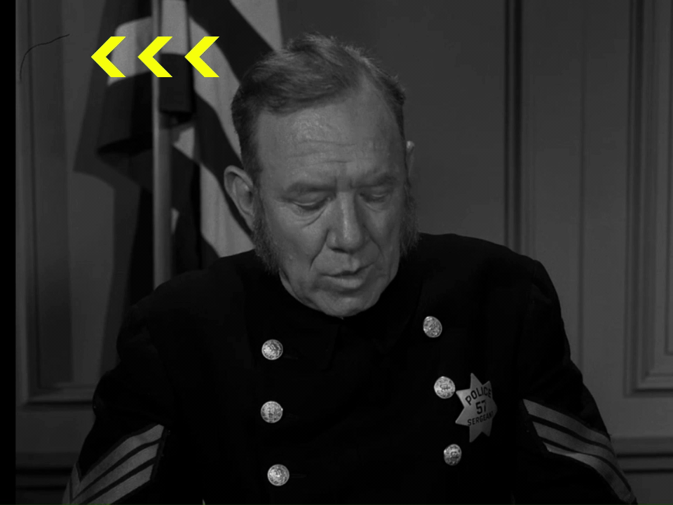 • During the police station scenes, one of the cameras used for some of the close-up shots suffered from a “hair in the gate.” This is when an actual hair or a sliver of broken-off film gets trapped in the camera’s film gate. This hair blocks part of the film, preventing it from being exposed. Since these hairs couldn’t be seen through the viewfinder, a hair in the gate could ruin a shot and might not be noticed until editing. Sets often stopped to “check the gate” after each shot to ensure that the footage was usable since it was extremely difficult to edit out such hairs in the pre-digital age. In the close-ups of the police sergeant and then of the patrolman who suggests putting extra guards on Lincoln, a small hair can be seen in the top right corner of these shots. Evidently, someone didn’t “check the gate” during these shots.