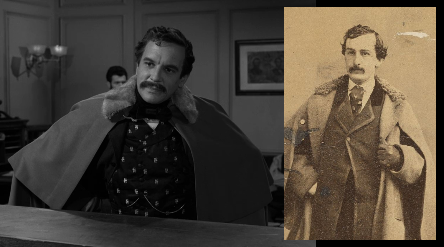 • “Back There” did a great job of costuming Lasell as John Wilkes Booth. From the moment he arrives at the police station, it is clear that he is a man of elegance. Even the otherwise curt police sergeant speaks to him reverently because of his dress and appearance of standing. The long coat that “Wellington” wears is a decent copy of a similar fur-collared coat that Booth wears in multiple photographs.