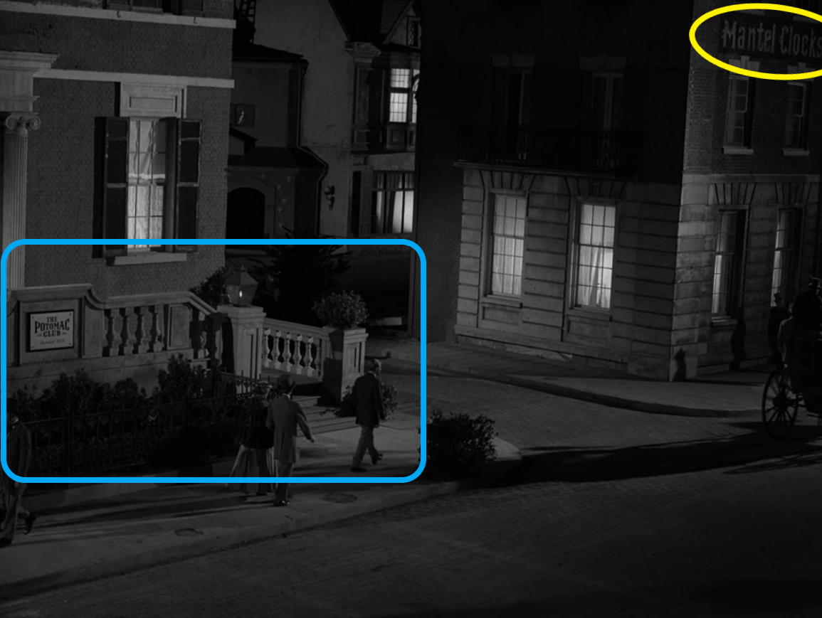 When the camera pans back to Corrigan, his outfit has changed to a more Victorian style and his watch has disappeared off his wrist. He is confused by these changes, turns, and knocks on the door of the club he just exited. After a beat, Corrigan turns around and tells himself to go home. He slowly walks down the steps of the Potomac Club landing and notices other changes have occurred. On the street are horse-drawn wagons. All of the pedestrians are also dressed in Victorian garb, with the men wearing top hats. He rushes across the street and walks to his home, but the building now has a sign in front that says “Rooms to Let.” Finding the door locked, he knocks on the door. It is answered by a woman named Mrs. Landers. Corrigan looks around the inside of the house, thinking he has come to the wrong address.