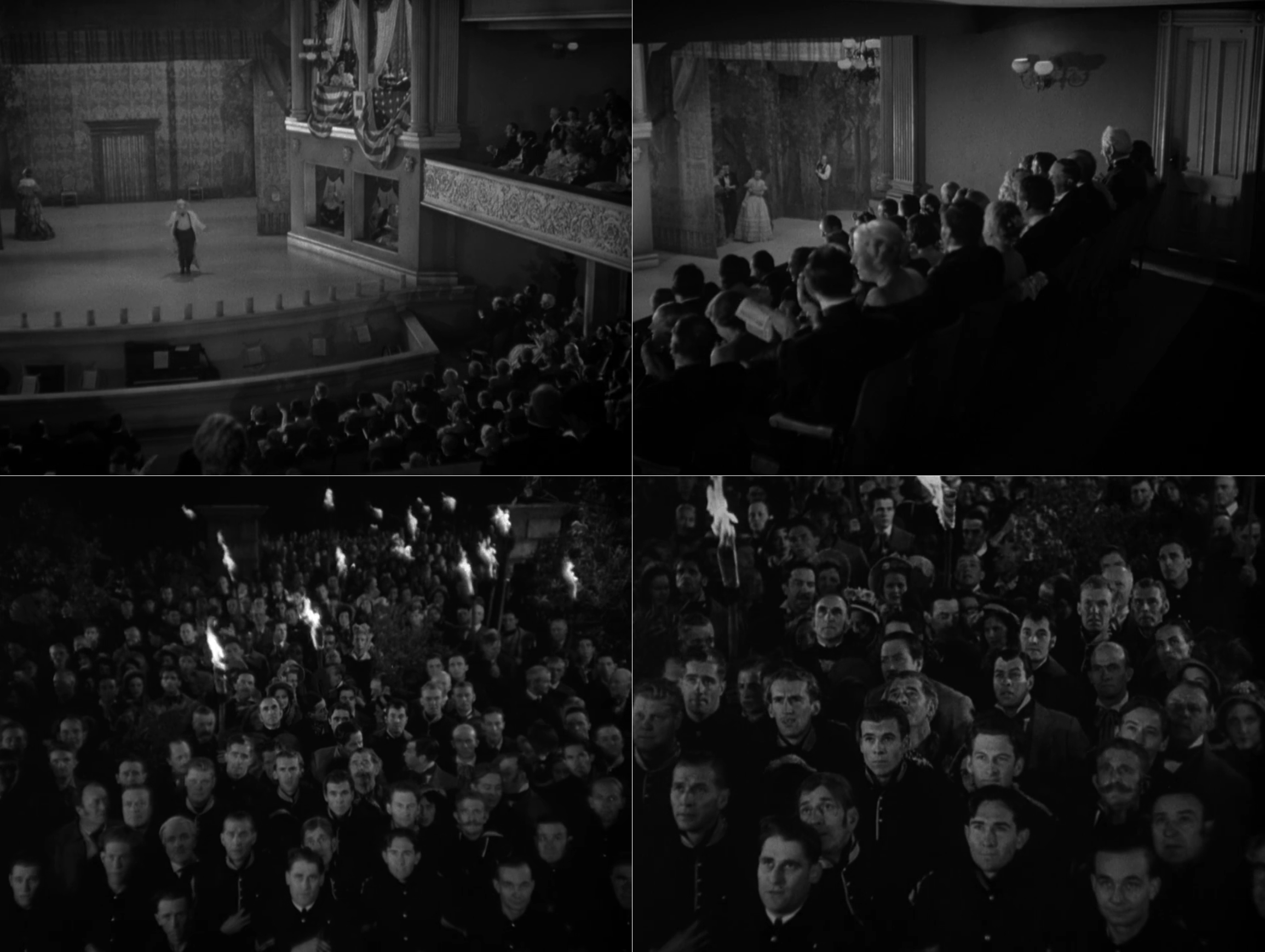 I knew that these scenes had to have come from somewhere else, so I reached out to Richard Sloan, an expert on Lincoln in film and TV, and asked him if they looked familiar. He quickly recognized that Frank McGlynn, Sr., a regular Lincoln actor, portrayed the Lincoln in the box. Richard determined that the Ford’s Theatre scenes came from the 1936 film The Prisoner of Shark Island, which tells a largely fictional tale about the arrest and imprisonment of Dr. Samuel Mudd. With this lead, I was able to determine that the crowd scenes also come from The Prisoner of Shark Island and depict the crowd that arrives at the White House at the beginning of the film to hear McGlynn’s Lincoln speak about the surrender of Robert E. Lee.